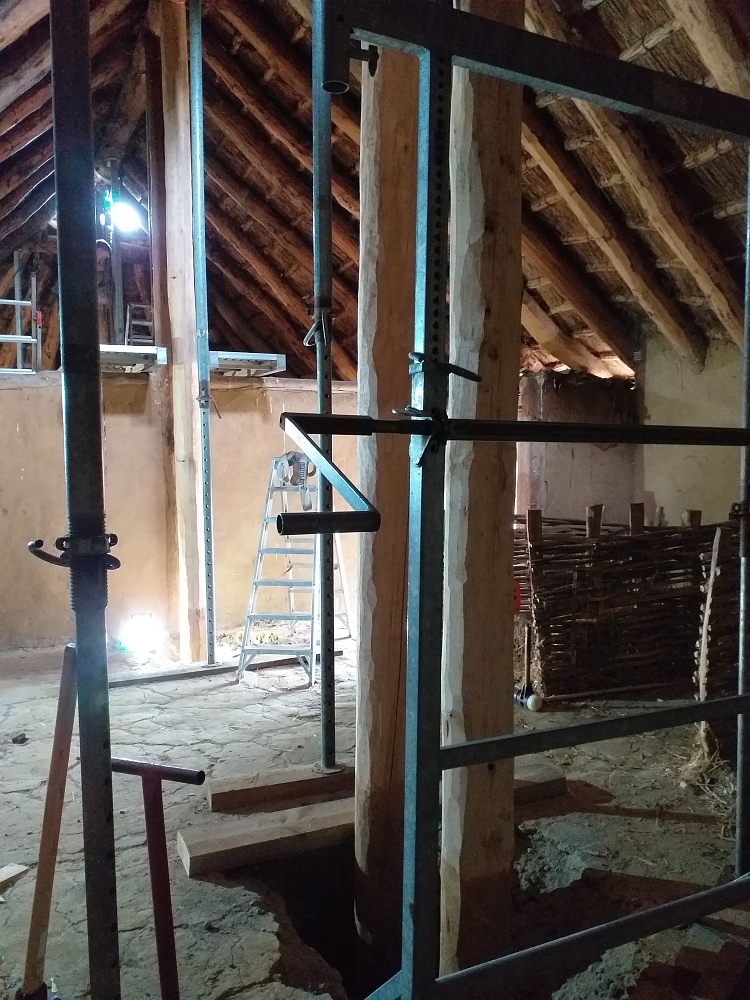 Für das Rausholen müssen die Pfosten zunächst entlastet werden. Zu diesem Zweck bauen wir Stützen ein, die, unter Spannung gebracht, die Funktion der beiden hinteren Pfosten im Stallteil fortan übernehmen. Sie sind sozusagen wie Krücken für uns Menschen, wenn wir mal ein Bein nicht voll belasten können. Dabei ist es mucksmäuschenstill, denn jedes Knacken verrät etwas über das, was gerade im Gebälk passiert, wo Spannungen frei werden oder neu entstehen oder irgendetwas anderes seltsames passiert...